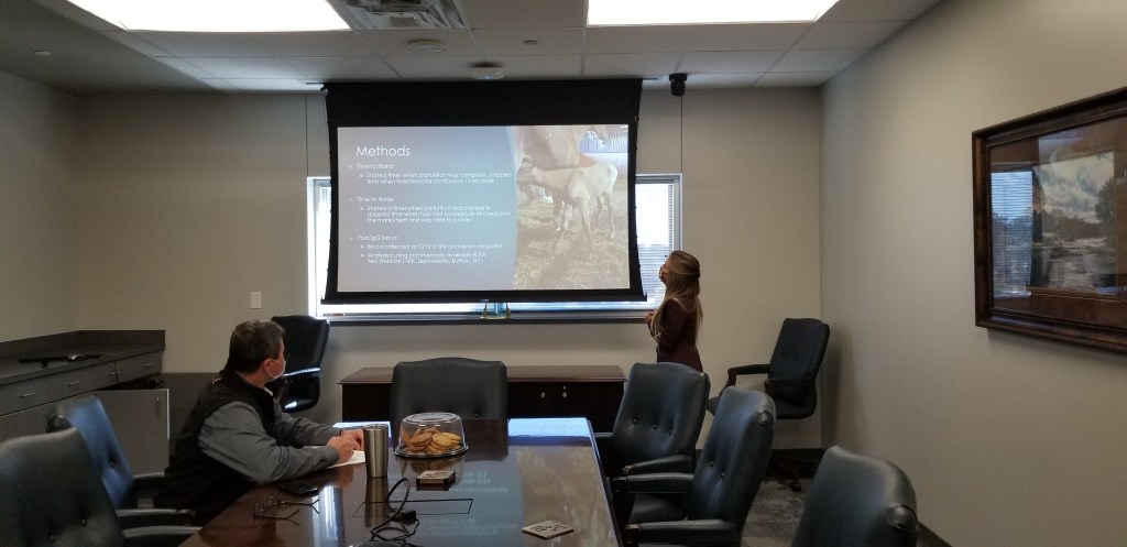 Abby supplemented late gestation broodmares with either flax or fish oil in order to determine which oil source would promote the most uptake of omega 3 fatty acids in newborn foals.
